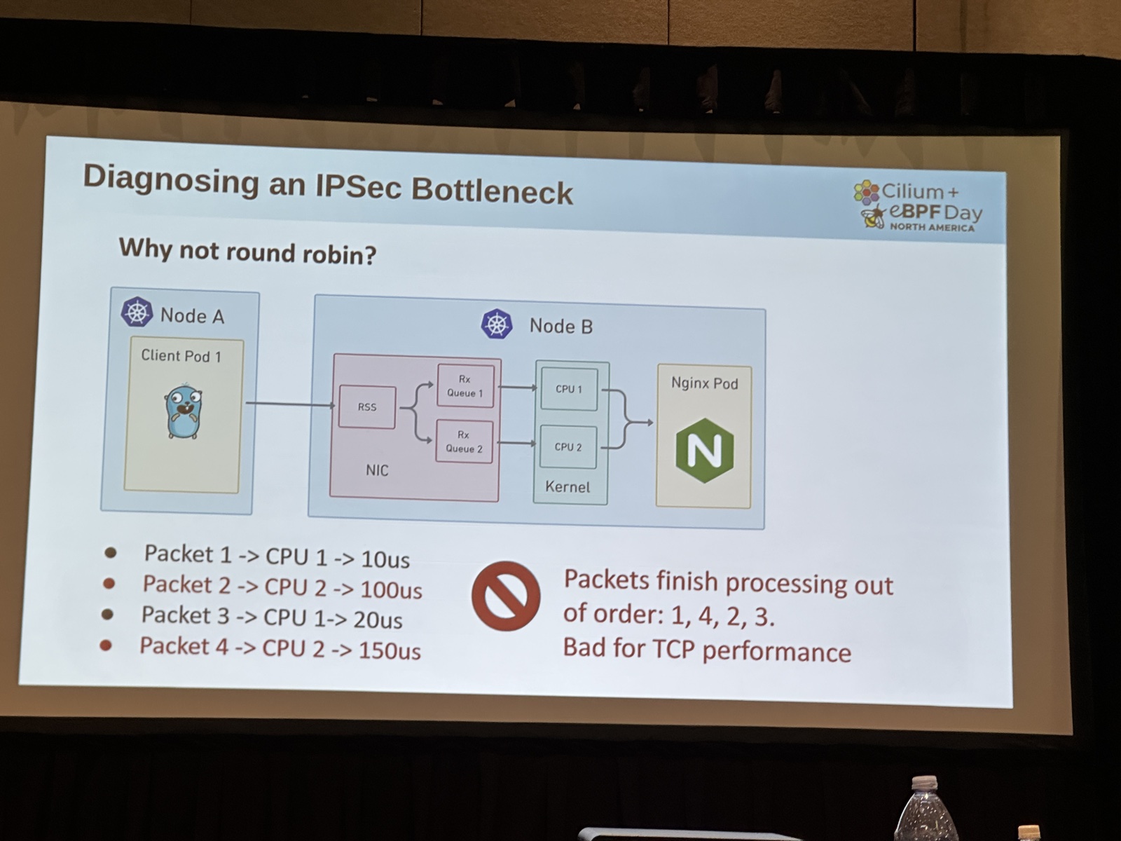 TIL about the Toeplitz hashing method leveraged at the NIC level to distribute packets. This in turn unlocked the use of more than one core and naturally amplified throughput to unprecedented levels. I also learned that out of the box, eBPF programs will be pinned to a single core. One process, one or more threads pinned to a core. Ryan stated it is seemingly impossible to evenly distribute across multiple cores meaning sporadic bottlenecks at scale even with the gains seen here.