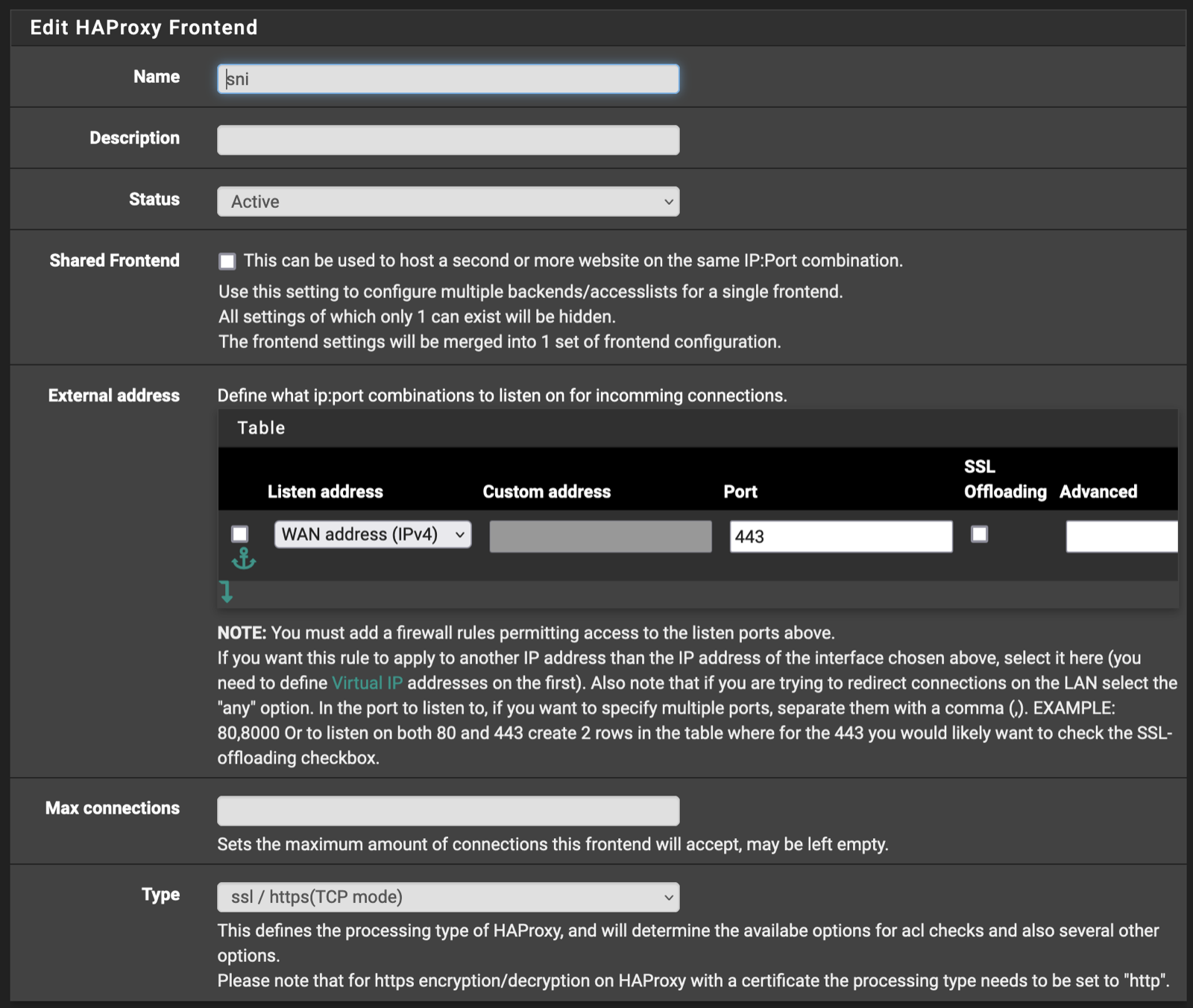But what of the HTTPS? Well that's the next and last frontend we must define. Return to the Frontend tab and add a new one. I called my sni since that is what will be employed over :443. Much overlap with the http frontend. Key differences include the change of WAN address port, and the frontend type now set to ssl / https(TCP mode).