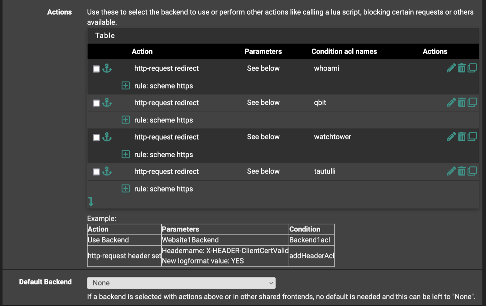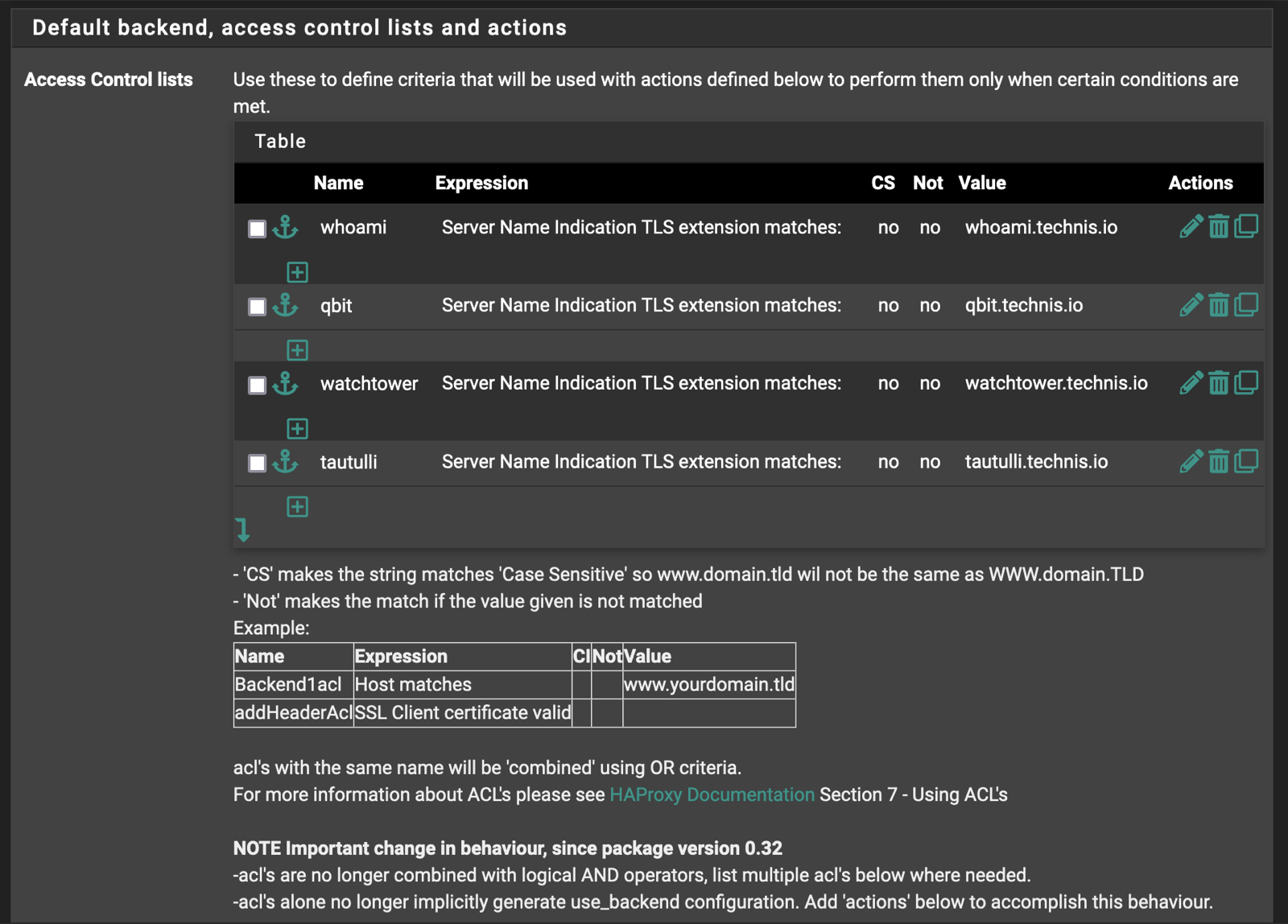 Now we set the ACLs for each of the host headers we'll be explicitly forwarding to particular backends.