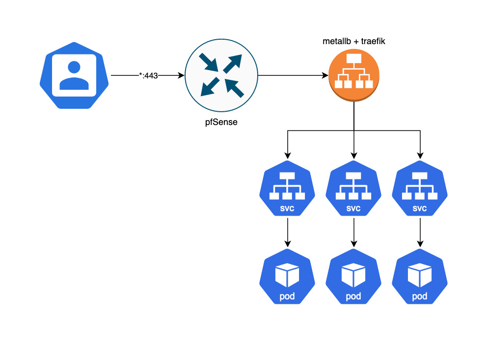 Both clusters have apps that I would like to expose to the internet so that friends, family, and I can access without having to drive into wifi range. In the past, I had configured a wildcard of *.techn.is via Cloudflare to my public IP. CF would redirect all traffic on :80 to :443 and pfSense would NAT/port-forward to Traefik on hades via a LoadBalancer service (*powered by metallb)