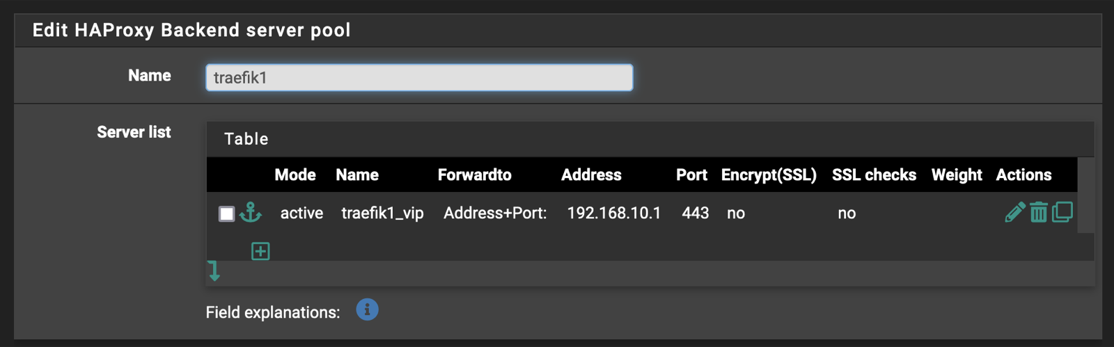 Under the Backend tab, we define each of the backends (in this case two Traefik instances) that HAProxy will forward traffic to.